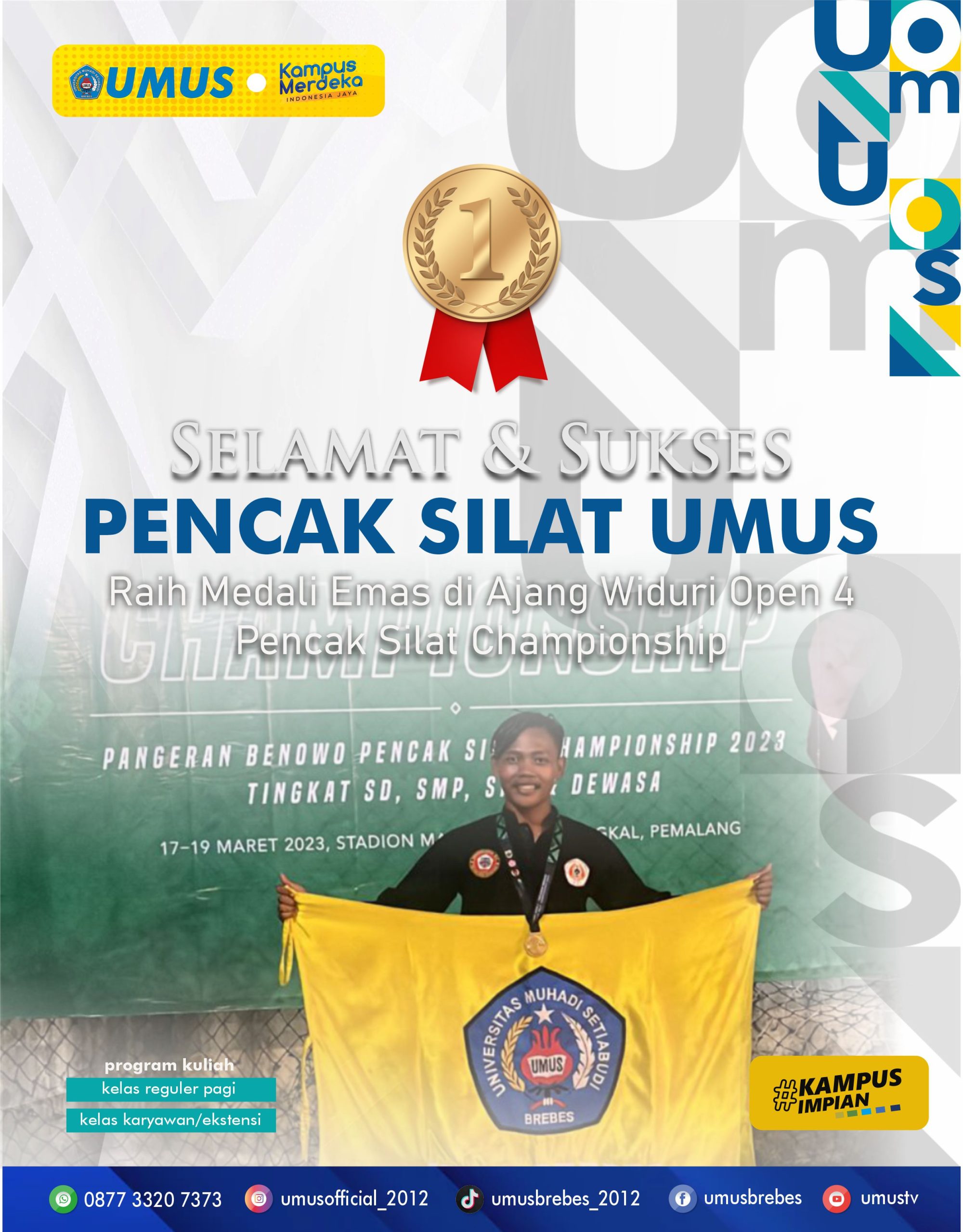 Humas UMUS– Universitas Muhadi Setiabudi yang berslogan EPIK ( Entrepreneur, Profesional, Inovatif dan Kearifan Lokal) kembali diharumkan namanya melalui raihan prestasi yang ditunjukan oleh mahasiswa pada ajang pencak silat tingkat Provinsi Jawa Tengah di Widuri Open 4 Pencak Silat yang digelar di Stadion Mochtar Kabupaten Pemalang pada tanggal 17-19 Maret 2023.