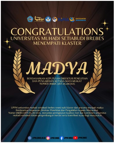 Universitas Muhadi Setiabudi (UMUS) resmi menempati Klaster Madya dalam Klasterisasi Perguruan Tinggi Tahun 2026 yang dirilis oleh Direktorat Jenderal Riset dan Pengembangan, Kementerian Pendidikan Tinggi, Sains, dan Teknologi. Penetapan tersebut tercantum dalam Keputusan Direktur Penelitian dan Pengabdian kepada Masyarakat Nomor 0968/C3/DT.05.00/2025, yang mengevaluasi kinerja riset dan pengabdian kepada masyarakat perguruan tinggi pada periode 2022–2024.