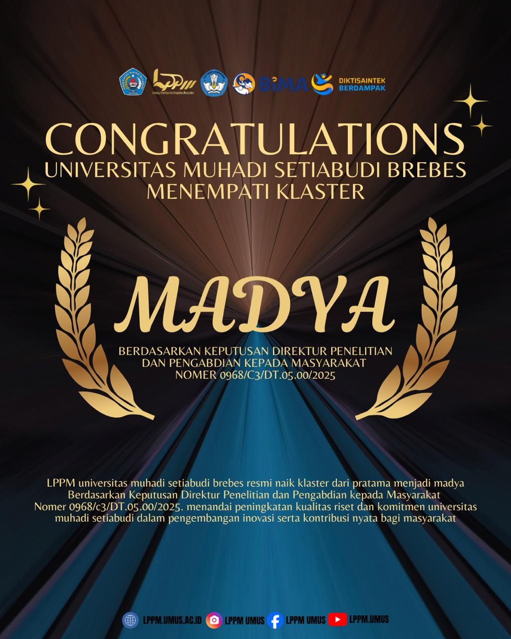 “Klaster Madya bukan sekadar kategori, tetapi milestone yang menegaskan bahwa UMUS berada pada jalur pengembangan yang tepat. Kami berkomitmen memperluas jejaring kerja sama riset, mendorong inovasi, serta meningkatkan kapasitas dosen dan mahasiswa agar mampu bersaing di tingkat nasional maupun internasional,” tegasnya.