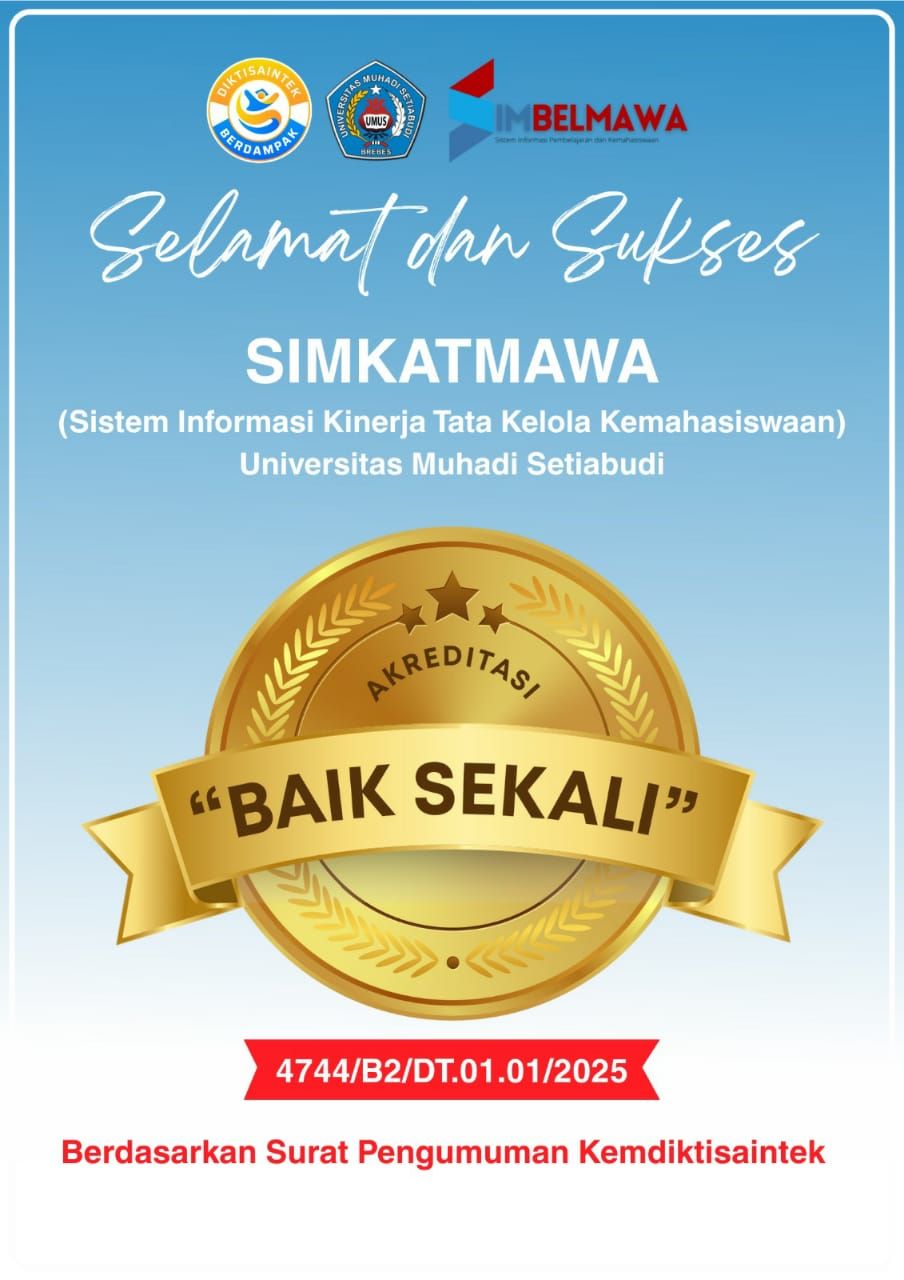 Universitas Muhadi Setiabudi (UMUS) kembali mencatatkan prestasi membanggakan di tingkat nasional. Pada tahun 2025, UMUS resmi meraih predikat akreditasi BAIK SEKALI dalam penilaian Sistem Informasi Kinerja Tata Kelola Kemahasiswaan (Simkatmawa), sebuah instrumen resmi Kementerian Pendidikan, Kebudayaan, Riset, dan Teknologi yang menilai kinerja pengelolaan kegiatan kemahasiswaan di perguruan tinggi seluruh Indonesia.