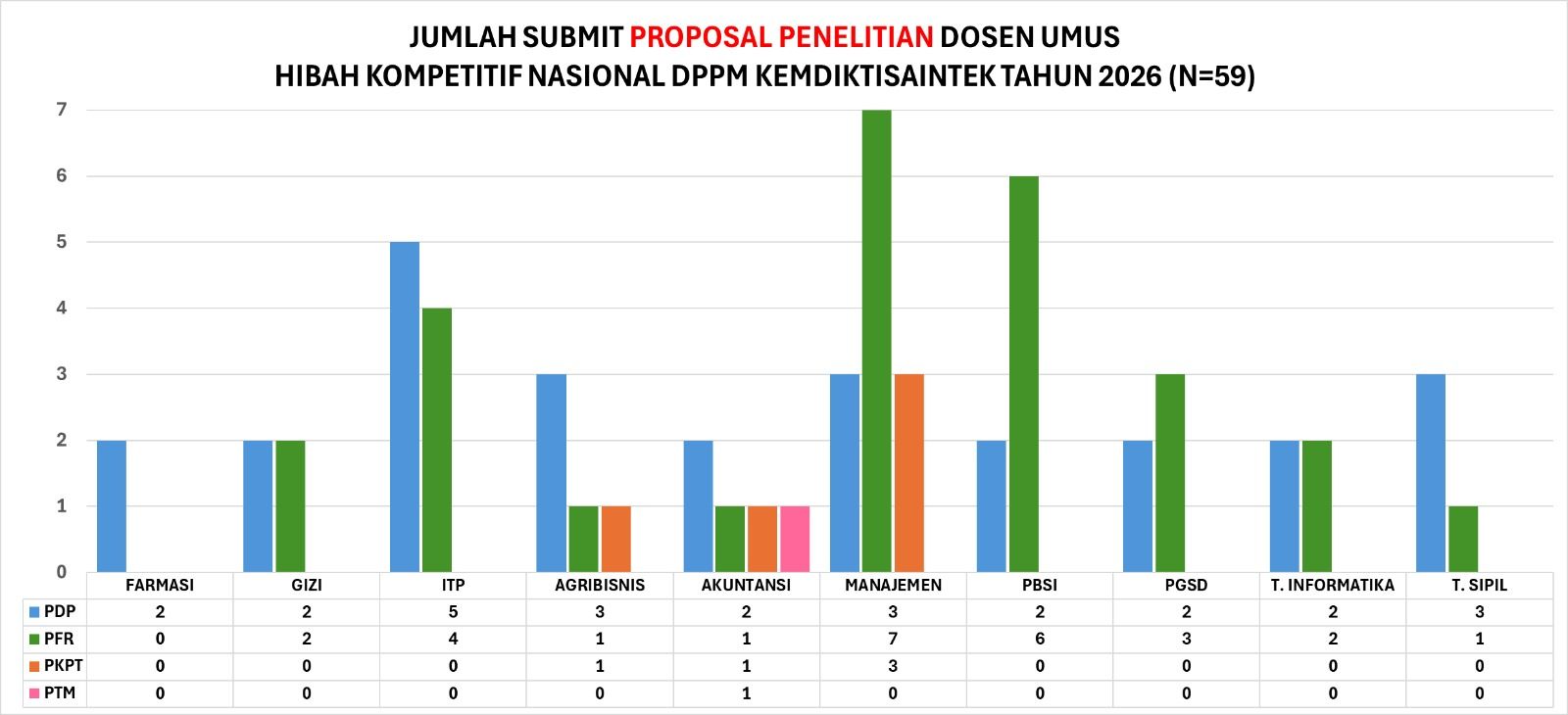 Universitas Muhadi Setiabudi (UMUS) mencatatkan capaian positif dalam pengusulan hibah penelitian dan pengabdian kepada masyarakat pada tahun 2026. Berdasarkan data rekapitulasi usulan, total proposal yang diajukan dosen UMUS mencapai 81 usulan, yang terdiri atas 59 usulan hibah penelitian dan 22 usulan hibah pengabdian kepada masyarakat. Capaian ini mencerminkan semakin kuatnya integrasi Tri Dharma Perguruan Tinggi di lingkungan UMUS.