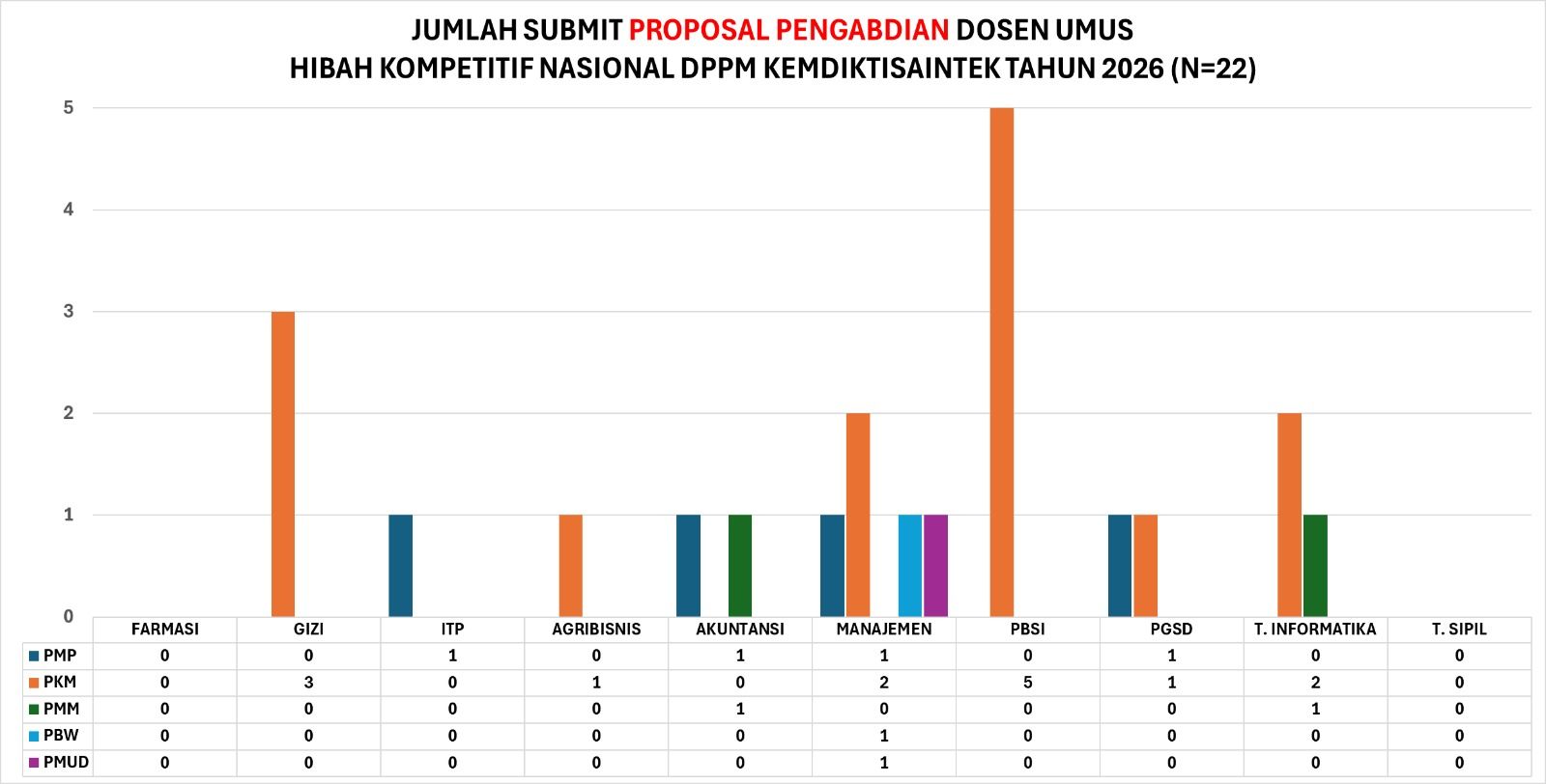 Secara kelembagaan, kontribusi terbesar usulan pengabdian datang dari Program Studi Manajemen dan PBSI yang masing-masing mengusulkan 5 proposal. Program Studi Gizi dan Teknik Informatika juga menunjukkan partisipasi aktif dengan masing-masing 3 proposal, sementara Akuntansi dan PGSD menyumbang masing-masing 2 proposal. Keterlibatan lintas program studi ini mencerminkan orientasi pengabdian UMUS yang semakin kontekstual dan berbasis kebutuhan masyarakat.