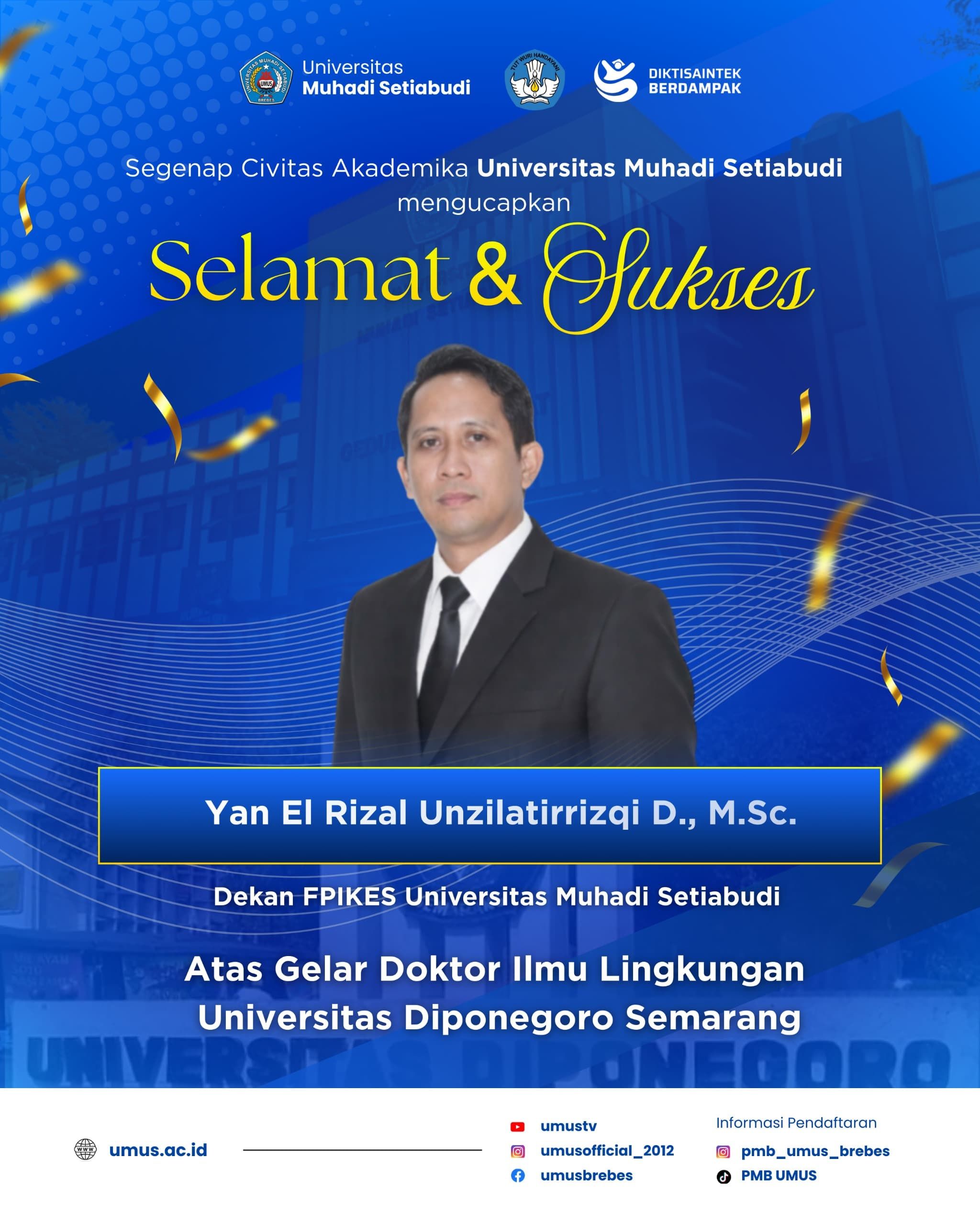 Kabar membanggakan datang dari dunia pendidikan tinggi di Kabupaten Brebes. Dr. Yan El Rizal Unzilatirrizqi D., S.Si., M.Sc., salah satu putra terbaik sekaligus dosen Universitas Muhadi Setiabudi (UMUS), sukses menyabet gelar Doktor Ilmu Lingkungan dari Universitas Diponegoro (UNDIP) dengan predikat Cumlaude dan IPK Sempurna 4,00.